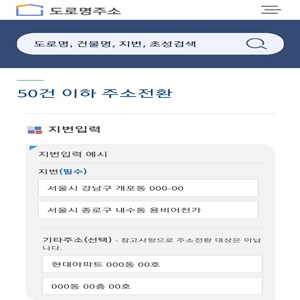 화면 하단의 ^주소전환^ 버튼을 클릭하여 지번과 기타주소를 입력하면 자동으로 지번 주소를 도로명 주소로 변환할 수 있습니다. 위 항목에서는 50건 이하의 지번을 한꺼번에 도로명 주소로 변환할 수 있기 때문에 사무작업이나 다수의 주소 변환이 불가피할 때 이용하면 좋을 것 같습니다.