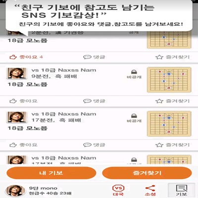 단순히 장기 게임을 즐기기 위해 이용할 수도 있지만 다양한 사람들의 기보를 감상하면서 보다 깊게 장기를 배울 수 있다는 점도 모바일 장기 게임 어플의 묘미입니다. 이 어플에서는 사용자의 기보를 SNS처럼 공유하고 댓글도 남길 수 있어 커뮤니케이션이 발달되어 있는 편입니다.