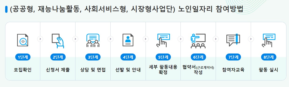 방문신청을 하는 경우 주민센터 혹은 시·군·구청의 노인일자리 사업 담당 수행기관을 찾아가 담당자의 도움으로 신청서를 작성할 수 있습니다. 온라인 신청의 경우 복지로(http://www.bokjiro.qo.kr) 사이트에서 신청서를 제출할 수 있고 진행 절차와 안내사항, 신청 결과에 대해 수행기관의 담당자가 신청인에게 개별 연락을 주어 사업을 진행하고 있습니다.