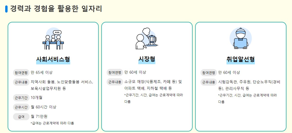 노인일자리 사업의 신청 대상자는 만 65세 이상 노인으로, 공식적으로는 ^사회활동 지원사업 참여조건에 부합하는 자^로 명시되어 있지만 연령대를 제외한 특별한 요건은 필요하지 않으며 사업의 유형마다 대상 연령에 차이가 있기 때문에 위와 같이 표기되어 있습니다.